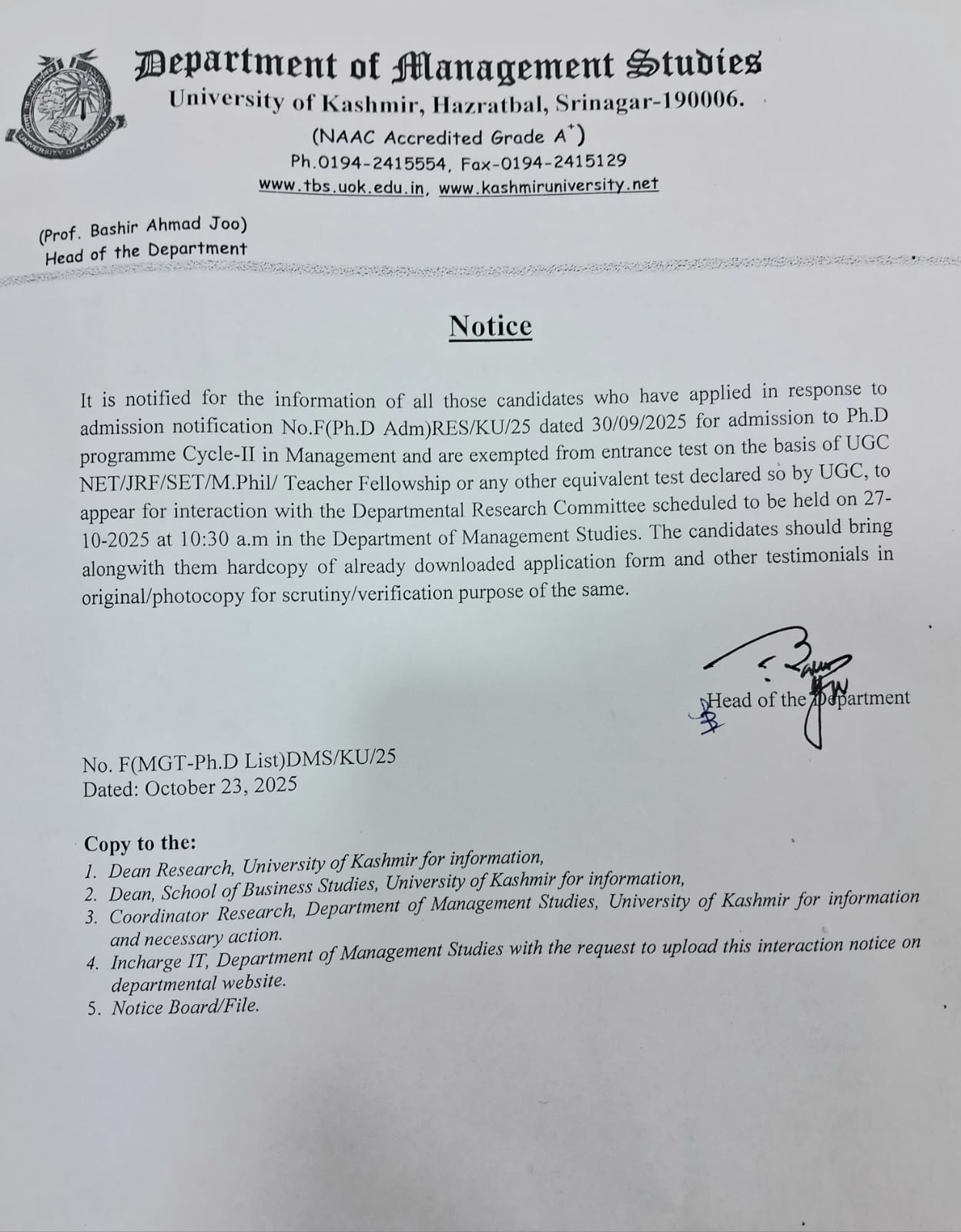 Ph.D/ I-Ph.D Synopsis submission date extended; Dated: 26-12-2020